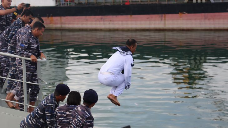 Bagi prajurit Bintara dan Tamtama dilaksanakan tradisi khas TNI-AL yaitu Voor den Boeg di geladak haluan KRI Banda Aceh-593, karena 3 prajurit berpangkat Kelasi Kepala naik menjadi Kopral Dua. Selanjutnya seluruh prajurit KRI Banda Aceh-593 memberi ucapan selamat kepada prajurit yang telah naik pangkat dan dilaksanakan tradisi lompat kelaut dari atas kapal.