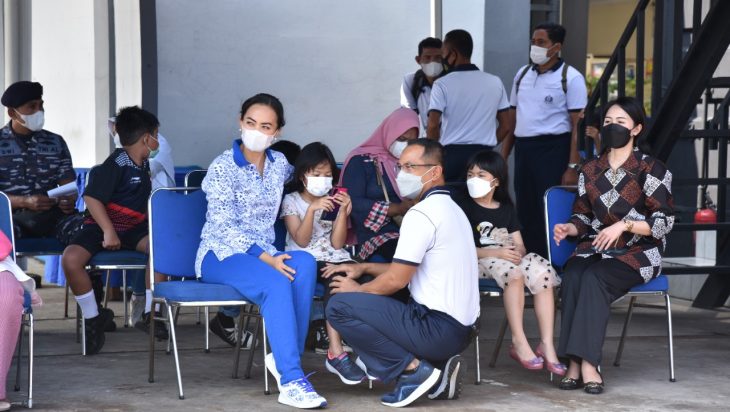Jakarta, PUBLIKASI – Panglima Komando Lintas Laut Militer meninjau langsung vaksinasi Covid-19 dosis 1 dan dosis 2 bagi anak usia 6-12 tahun yang dilaksanakan di Officer Cafe, Mako Kolinlamil, Tanjung Priok, Jakarta Utara, Jumat (4/2). Bersama dengan Ibu Ketty Erwin S Aldedharma, Panglima Kolinlamil mendampingi putrinya untuk mendapatkan vaksin Sinovac dosis 2.