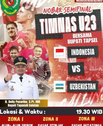Tapanuli Selatan, PUBLIKASI — Pemerintah Kabupaten (Pemkab) Tapanuli Selatan (Tapsel) akan menggelar acara nonton bareng (Nobar) Semi Final Piala AFC Asian Cup U23 Indonesia VS Uzbekistan di 3 (tiga) zona untuk Zona I di Alun-alun Adian Pardomuan Kecamatan Sipirok, zona II di Pasar Sitinjak Kecamatan Angkola Barat dan zona III di Pasar Huta Tonga Kecamatan Batang Angkola, Senin (29/4).