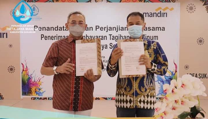 Sukabumi, PUBLIKASI – Direktur Utama Perumda Air Minum TJM H. M. Kamaludin Zen dan Area Head Sukabumi Suhedi melakukan penandatanganan kerjasama akses terbaru pembayaran tagihan air online Perumda Air Minum TJM Kabupaten Sukabumi dengan PT. Bank Mandiri (Persero) Tbk. Peresmian kerjasama ini berlangsung pada hari Jumat tanggal 14 Januari 2022 di PT.Bank Mandiri (Persero) Tbk Cabang Sukabumi.