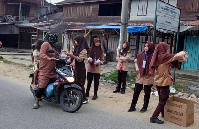 Padang Lawas, PUBLIKASI – Peserta pesantren kilat Kwartir Cabang (Kwarcab) Gerakan Pramuka Padang Lawas (Palas) bagi – bagi takjil kapada masyarakat dan penguna jalan, di Jalan lintas Sibuhuan – Sosopan, Desa Paringgonan, Kecamatan Ulu Barumun, Palas, Sabtu 9 Apri 2022.