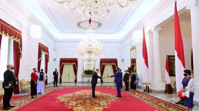 Penyerahan surat kepercayaan tersebut digelar di Ruang Kredensial, Istana Merdeka, Jakarta, Rabu (1/9/2021). Prosesi acara penyerahan surat kepercayaan dimulai dengan diperdengarkannya lagu kebangsaan dari masing-masing negara sahabat setelah duta besarnya tiba di Istana Merdeka.