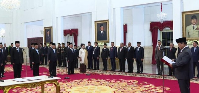 Seperti biasanya proses pelantikan diawali dengan menyanyikan lagu kebangsaan ‘Indonesia Raya’, kemudian dilanjutkan dengan pembacaan keputusan presiden. Prabowo kemudian mengambil sumpah jabatan anggota Kompolnas.