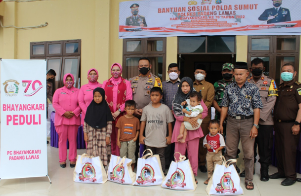 Padang Lawas, PUBLIKASI – Dalam rangka menyemarkkan hari ulang tahun ( HUT) Bhayangkara ke -76, tahun 2022, Polres Padang Lawas ( Palas) menggelar kegiatan bakti sosial ( Baksos) dan Bantuan Sosial (Bansos) berupa  bantuan paket sembako sebanyak 500 paket, kepada anak yatim, bilal mait, pengurus masjid, pengurus greja dan kaum dhuafa.