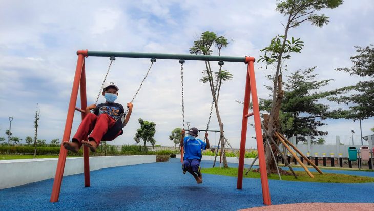 “Sering sekali saya main kesini sama teman-teman, tempatnya luas dan bagus ada juga permainan ular tangga, ayunan, dan banyak tanaman. Saya juga sudah divaksin jadi boleh masuk kesini. Pokoknya seru banget dan pastinya akan datang kesini lagi,” ujar Ator (10), siswa MI At Taqwa 20 Karang Tengah, Tarumajaya, Bekasi. (M Siddiq)