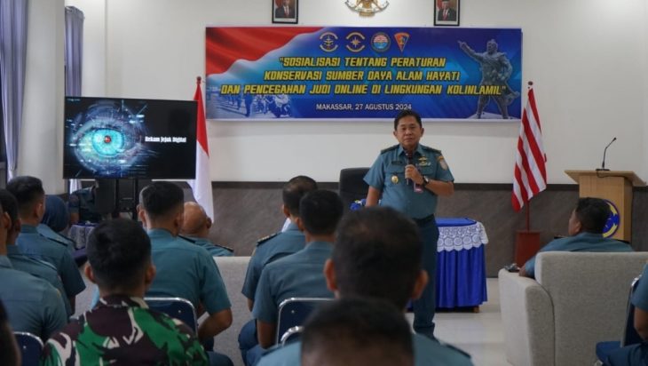 Makassar, PUBLIKASI — Personel Satuan Lintas Laut Militer (Satlinlamil) 3 dan ABK KRI Teluk Hading-538 menerima Sosialisasi tentang Peraturan Konservasi Sumber Daya Alam Hayati dari Balai Konservasi Sumber Daya Alam (BKSDA) Sulawesi Selatan, Pencegahan Judi Online dari Pomal Kolinlamil, dan Rekam Jejak Digital dari Disinfolahta Kolinlamil, bertempat di Ruang Rapat Mako Satlinlamil 3, Jalan Teuku Umar, Makassar, Selasa (27/8).