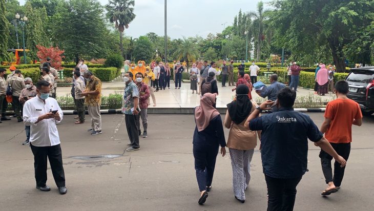 Jakarta, PUBLIKASI – Ratusan Aparatur Sipil Negara (ASN), pegawai, hingga tamu mengevakuasi diri di halaman Kantor Walikota Administrasi Jakarta Utara saat terjadinya gempa 6,7 Skala Richter (SR) yang berpusat di 52 kilometer Barat Daya Sumur, Banten, Jumat (14/1).