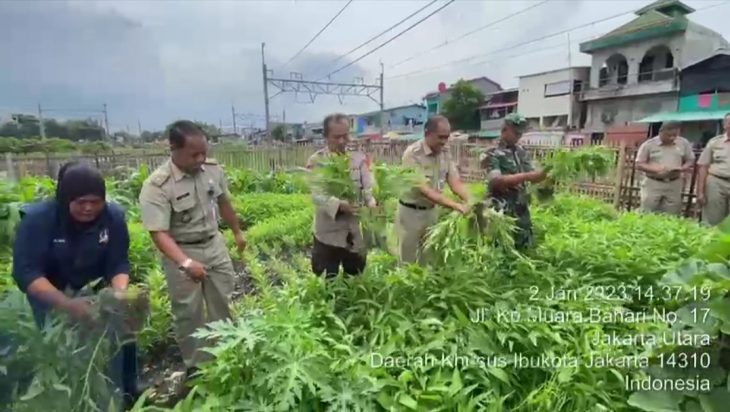 Jakarta, PUBLIKASI – Areal perlintasan tengah rel KAI A.5 dan A.14 yang berada di lingkungan RW 07 dan RW 015 Kelurahan Tanjung Priok, Kecamatan Tanjung Priok dimanfaatkan menjadi lokasi perkebunan dengan berbagai tanaman seperti jagung, kangkung, labu, cabai, tomat, kemangi, dan anggur.