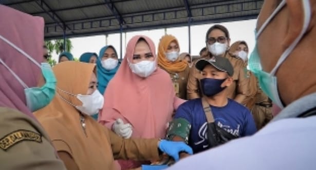 Langkat, PUBLIKASI – Ketua TP PKK Kabupaten Langkat Tiorita Terbit Rencana PA meninjau vaksinasi massal dalam rangkah memperingati Hari Kesehatan Nasional (HKN) ke 57, di Gedung Olahraga Desa Teluk, Kecamatan Secanggang, Langkat, Selasa, (2/11/2021).