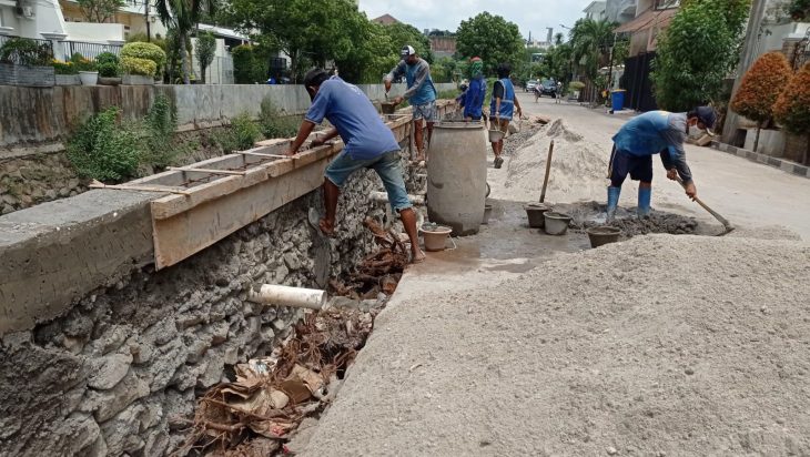 Jakarta, PUBLIKASI – Satuan Pelaksana Sumber Daya Air Kecamatan Kelapa Gading Jakarta Utara melakukan perbaikan tanggul di kali Gading Nias Jalan Janur Elok Raya Blok PE RT 01 RW 18 Kelurahan Pegangsaan Dua, Kecamatan Kelapa Gading, Jakarta Utara, Senin (13/9). Target perbaikan tanggul yang ambrol akibat erosi tersebut diperkirakan akan selesai akhir bulan September 2021.