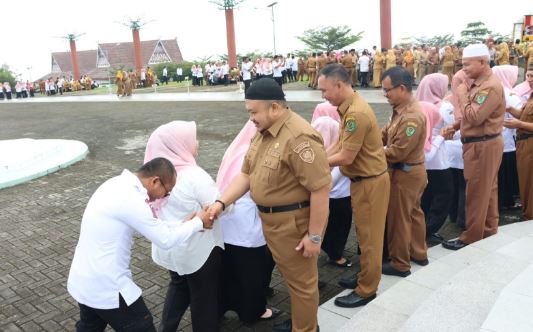 Usai pelaksanaan apel gabungan dilanjutkan dengan bersalam-salaman bersama Bupati, Sekda, pimpinan OPD dan seluruh ASN Tapsel. (Sakina Ramadhani/Hasim)